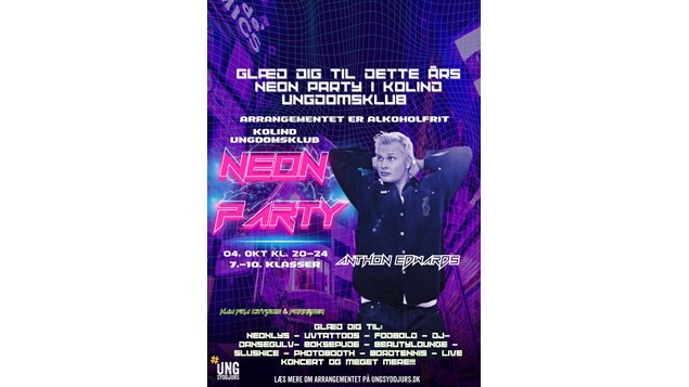 Fredag den 4. oktober 2024 bliver Kolind Ungdomsklub forvandlet til et lysende festmekka, når årets Neon Party løber af stablen. Med en live koncert fra Anthon Edwards og en række spændende aktiviteter, er der lagt op til en uforglemmelig aften for unge i 7.-10. klasse i Syddjurs Kommune.